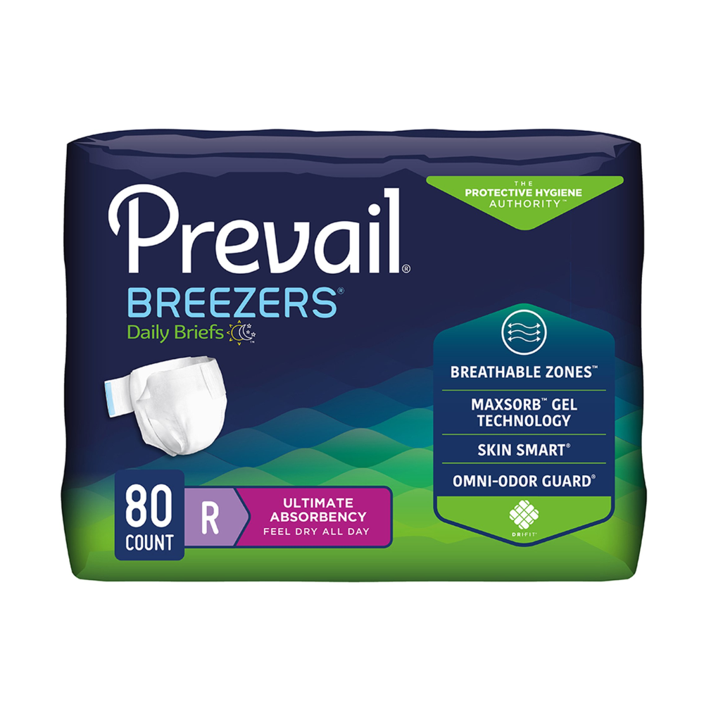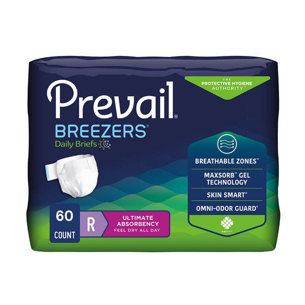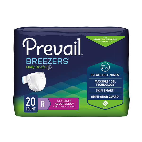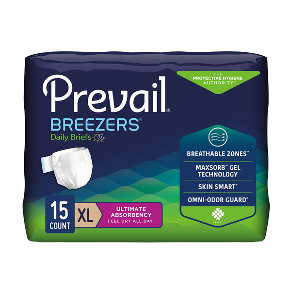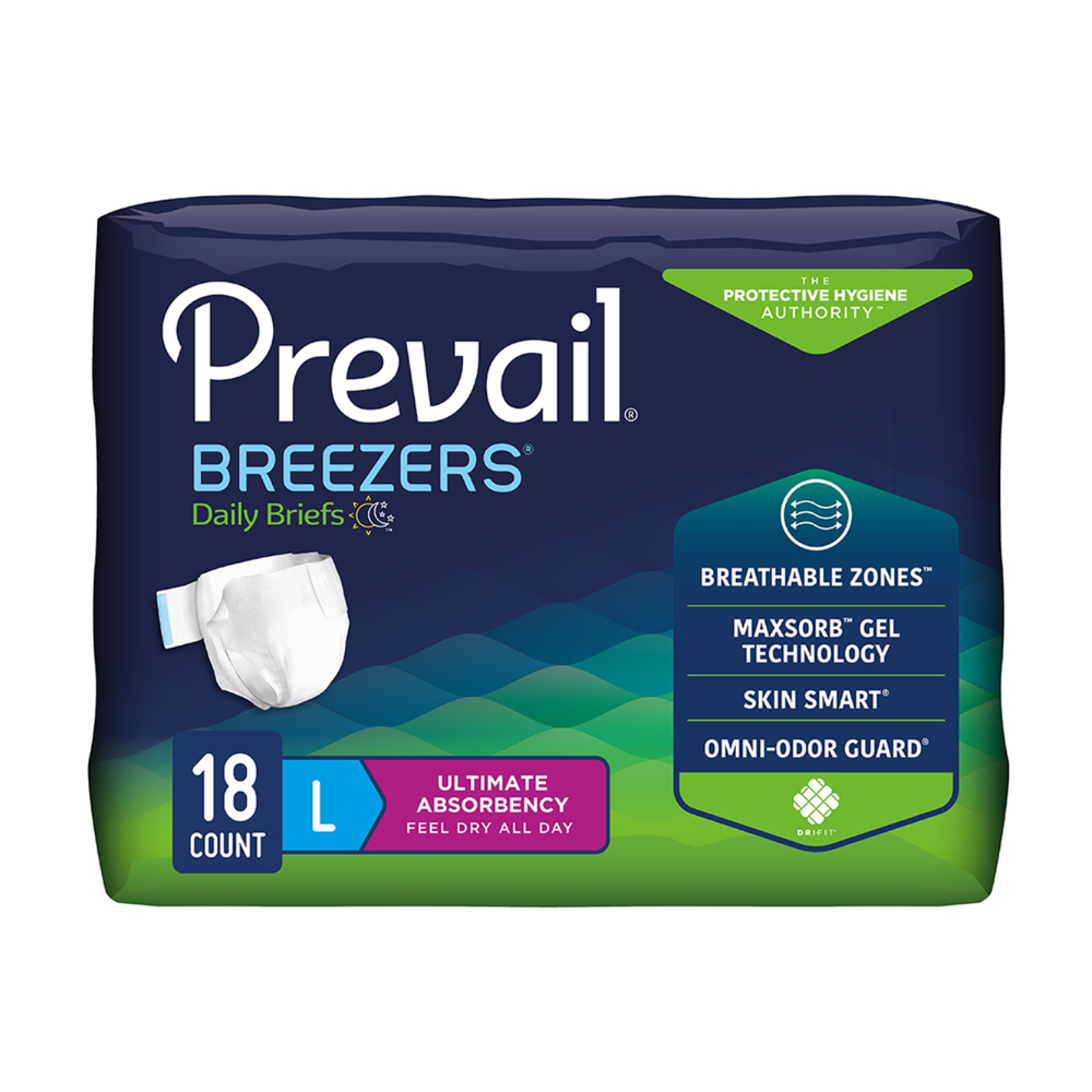 Prevail Breezers Adult Briefs, manufactured by First Quality, deliver maximum absorbency and all-day protection for adults managing moderate to heavy incontinence. Designed for both men and women, these premium disposable briefs combine advanced performance with superior comfort and skin health. The soft, cloth-like outer fabric ensures breathability and discretion, while the QUICK WICK with MaxSoft core rapidly pulls moisture away from the skin to maintain dryness and prevent leaks. The integrated Skin Smart Fabric, enriched with Aloe, Chamomile, and Vitamin E, helps protect sensitive skin from irritation and promotes healthy skin integrity even during extended wear. Each brief features Easy-Lock Fasteners for a secure, adjustable fit that won’t tear or lose adhesion, and built-in Odor Guard technology to neutralize odors for lasting freshness. Ideal for use in home care, long-term facilities, or active lifestyles, Prevail Breezers Adult Briefs provide dependable protection, comfort, and confidence with every wear.