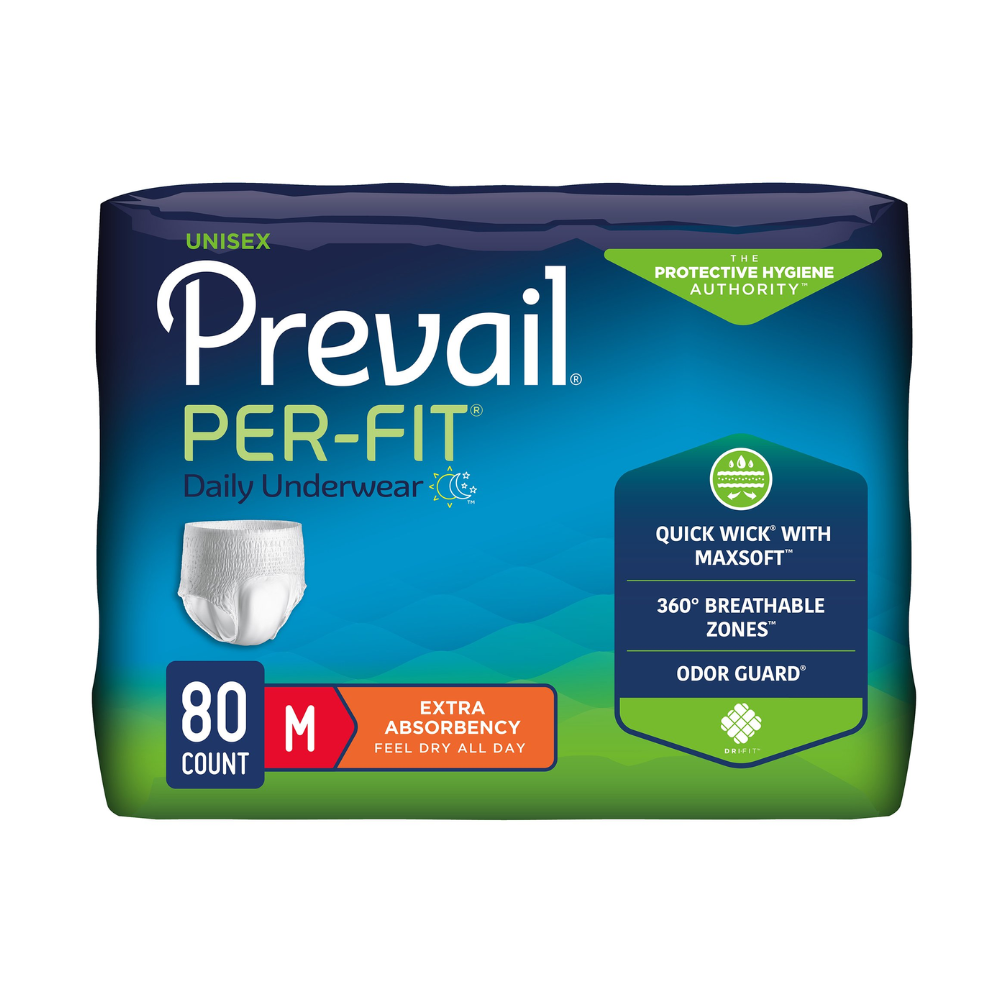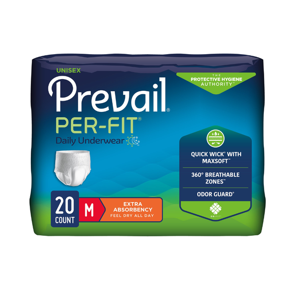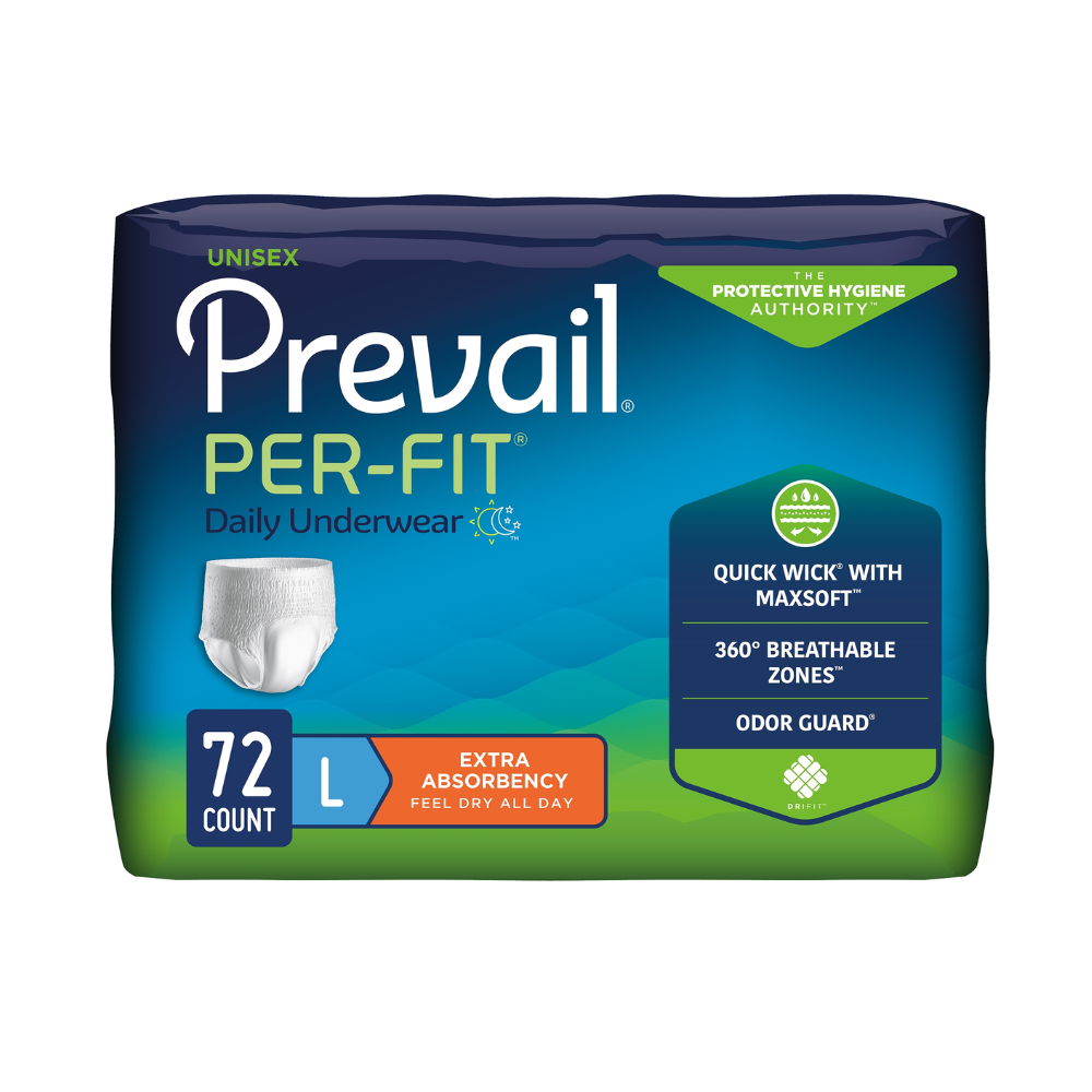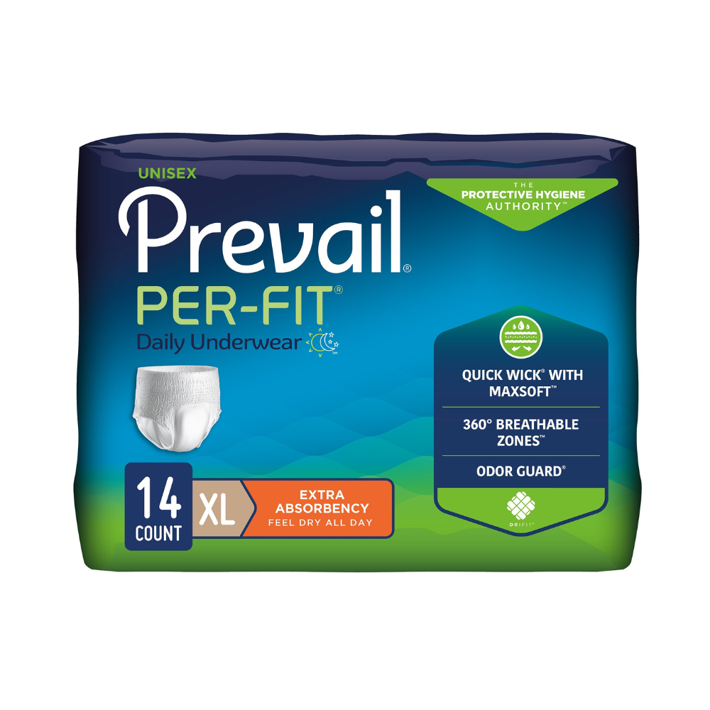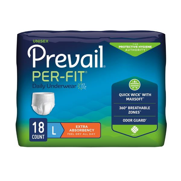 Prevail Per-Fit Protective Underwear, provides reliable and comfortable protection for adults with moderate to heavy incontinence. Designed to look and feel like regular underwear, it offers a discreet pull-on fit, superior absorbency, and advanced odor and moisture control. Made by First Quality Products, this unisex underwear promotes skin health, comfort, and confidence for everyday wear at home or in care facilities.