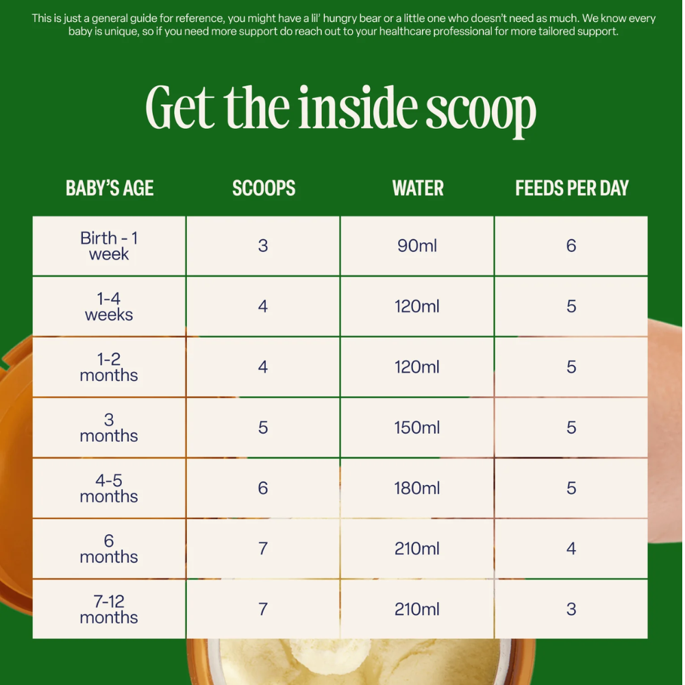 Add 1 level scoop of Kendamil Organic Infant Formula powder to each 1 fl oz (30 ml) of water.
