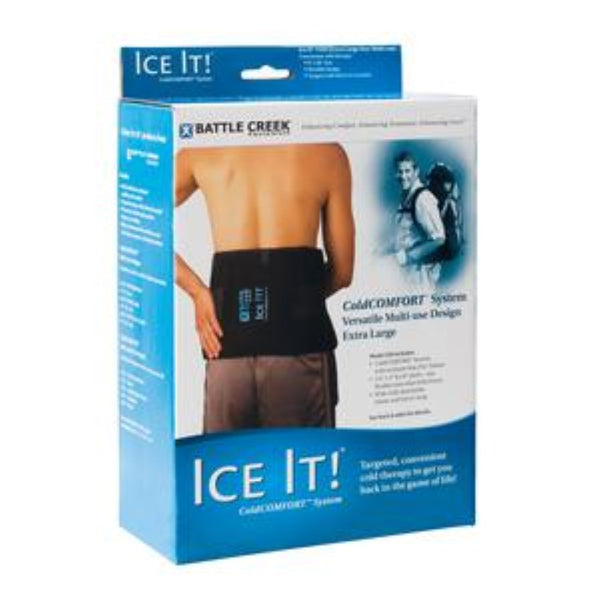 Extra-large Ice It!® ColdComfort™ therapy system includes three 6" x 9" cold packs, 9" x 20" fabric cover divided in three sections to hold each cold pack securely, and a wide, fully removable elastic strap with Velcro® fasteners on each end. Generous size for large areas, such as the back, hip or abdomen.