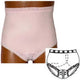 OPTIONS™ Split-Lace Crotch with built-in barrier/support, soft pink, right-side stoma, Medium 6-7, hips 37" - 41". Perfect for intimate moments, active daywear and when sleeping, allows air to flow to body. Split-crotch separates automatically for urination. 80% Nylon/20% Lycra. Ostomy Barrier/Support 100% Cotton-absorbs/wicks moisture away from skin.
