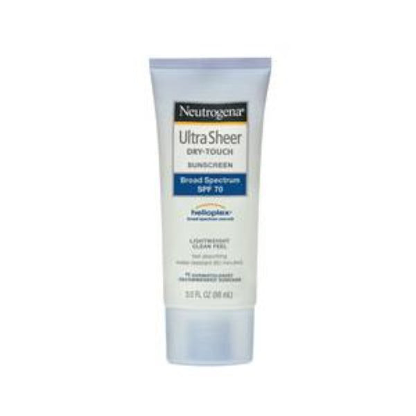 Cardinal Health Neutrogena Ultra Sheer Dry-Touch Sunscreen SPF70 is your ultimate defense against the sun's harmful rays. In a convenient 3-ounce tube, this advanced sunscreen boasts Helioplex Technology, offering an unrivaled shield against both UVA and UVB rays. With a focus on preventing the deep penetration of UVA rays under your skin's surface, it goes beyond the surface to provide superior protection. The Dry-Touch technology ensures a clean, lightweight, and non-shiny finish, offering sun protection that feels almost weightless on your skin.