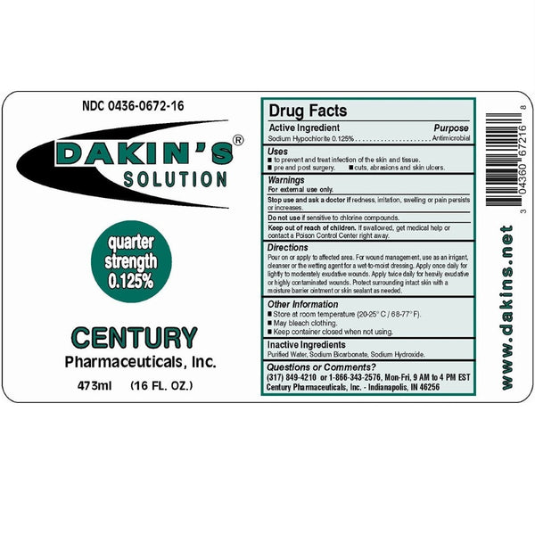 Century Pharmaceuticals Dakin's Solution 0.125% Quarter Strength Antimicrobial Wound Cleanser, 16 Oz. 473ml Bottle